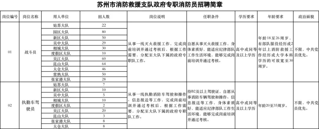 | 为有效履行防范化解重大安全风险、应对处置各类灾害事故的职责使命,进一步充实本市消防救援力量,现面向社会公开招聘政府专职消防员。有关事项公告如下: 一、招聘计划 ![]() 战斗员469名、执勤车驾驶员73名,共计542人。详情见附件1。 二、报考资格条件 (一)共同条件 1.具有中华人民共和国国籍的公民; 2.拥护中华人民共和国宪法,拥护中国共产党领导和社会主义制度; 3.具有良好的道德品行,热爱消防救援事业,具有忠诚、奉献、吃苦耐劳的精神,有高度的服从意识和团队协作精神; 4.具有正常履行职责的身体条件; 5.本人没有违纪违法、被开除公职或辞退等不良记录; 6.报考人员需准备相关材料,具体要求咨询报考大队(详见附件2); 7.符合下列条件者优先:中国共产党党员、解放军和武警部队退役军人、退出的国家队消防员和其他具有消防救援相关工作经历的人员、国家二级(以上)运动员。 (二)岗位条件 1. 战斗员 具有高中或同等及以上学历;年龄18至26周岁的男性,有部队服役经历或大学本科学历的可放宽至30周岁。 2. 执勤车驾驶员 具有高中或同等及以上学历;年龄20至35周岁的男性;报名驾驶员岗位人员应持有地方B2级及以上驾驶证,驾龄满1年。 (三)不予招录的情形 1. 受过刑事处罚或者治安管理处罚的; 2. 有个人不良记录的; 3. 因违纪违规被开除辞退的; 4. 受过党(团)、政纪处分的; 5. 家庭主要成员、直接抚养人、主要社会关系成员或者对本人影响较大的其他亲属涉嫌违法犯罪正在被调查处理,或者正在被侦查、起诉或者审判的;家庭主要成员、直接抚养人、主要社会关系成员或者对本人影响较大的其他亲属有危害国家安全行为的或者有严重政治性问题的; 6. 有影响工作的慢性腰腿痛、扁平足(足弓消失)、严重脱肛、疝气等疾病、主要器官或者部位有手术史; 7. 有纹身及影响面容、外观、功能的瘢痕; 8. 有疥疮、与麻风病人同吃同住等密切接触史、牛皮癣、头部黄疸、吸毒、性病以及其他传染病等; 9. 有经常胸痛、心慌、腹泻、吐酸水、咳嗽、哮喘、贫血、肾炎、结核病、肝炎(携带者)等; 10. 有癫痫(羊角风),经常头痛、头晕、晕厥,有精神病史,严重口吃(结巴)等; 11. 有遗尿症、梦游症等症状; 12. 有骨、关节、滑囊疾病或损伤及其后遗症,骨、关节畸形,胸廓畸形,习惯性脱臼,颈、胸、腰椎骨折史,腰椎间盘突出,强直性脊柱炎,影响肢体功能的腱鞘疾病; 13. 有腰椎间盘突出、半月板损伤、韧带损伤、强直性脊柱炎等疾病,影响从事消防救援工作的; 14. 有颅脑外伤,颅脑畸形,颅脑手术史,脑外伤后综合征等; 15. 已评定残疾等级、有其他严重疾病,身体明显缺陷、功能异常等; 16. 有法律规定的其他情形。 三、报名方法 1.本次报考采取通过网络平台报名(见附件3)或现场(线下)报名(见附件2)的方式进行。报名时间:2025年9月16日起,截止日期根据各大队招录情况而定。 2.应聘人员根据自身情况及报考岗位的资格条件和专业要求,在报名时填写一个报考岗位。 3.实行告知承诺制。考生报名时须按照公布的报考条件和岗位要求,如实填写报名信息。报考人员应对网上提交的信息和材料负责,如个人填报信息失真、不符合报考条件和岗位要求,由此造成的一切后果,责任自负。 四、应聘考核 报考战斗员、执勤车驾驶员岗位的需参加面试、体能测试、心理测试;执勤车驾驶员还应进行驾驶技能测试。考核具体时间、内容、地点及有关要求另行通知。 (一)资格审查 由各大队对报名人员进行初步资格审查。通过初审者,需按通知要求,携带相关材料(原件或复印件,具体要求咨询报考大队,详见附件2)进行现场复核。 (二)体能测试与心理测试 战斗员、执勤车辆驾驶员体能测试项目及标准参照《国家综合性消防救援队伍年度消防员招录体能测试、岗位适应性测试项目及标准》执行,体能测试科目为:1000米跑、俯卧撑、10×4往返跑。 心理测试:采用消防员招录心理测查系统进行,测试未通过者不予招录。 (三)驾驶技能测试 执勤车辆驾驶员需参加驾驶技能测试,考察履职所需的基础驾驶技能。 (四)面试 在体能、心理测试合格人员中确定面试人选,重点考察语言表达、逻辑思维、责任感、团队协作及应急反应能力等。 (五)体检 入职前需进行体检(费用自理),具体体检标准咨询各招录大队,联系方式详见(附件2)。 五、入职集训与聘用 (一)入职集训:拟录用人员需参加为期3个月的岗前封闭式集训,集训第一个月内与用人单位签订劳动合同,集训期满并考核合格者,首次合同期3年。集训期间发放实习工资,缴纳社保、公积金。集训由各大队组织实施,重点开展体能、技能、条令法规和思想政治教育。 (二)人员聘用:拟录用人员由招录单位按规定的程序和标准择优确定,签订劳动合同,参加岗前培训和考核,试用期为3个月。未能通过考核或未能完成岗前培训任务的,不予转正。 六、工资薪酬 队员第一年月平均到手工资不低于5000元,此后随着工作年限、岗位职务调整等逐年递增。 七、工作时间及休息模式 政府专职消防队员实行轮休制和年休制相结合的休息模式,工作时执行24小时驻勤制。入职后可享受带薪休假:选择轮休假的(须已婚且家在驻地)每周休息1个白天、2个晚上,此外根据工作年限每年享有5-15天假期;选择年休假的,根据工作年限每年享有35-45天假期。婚假、陪产假、丧假