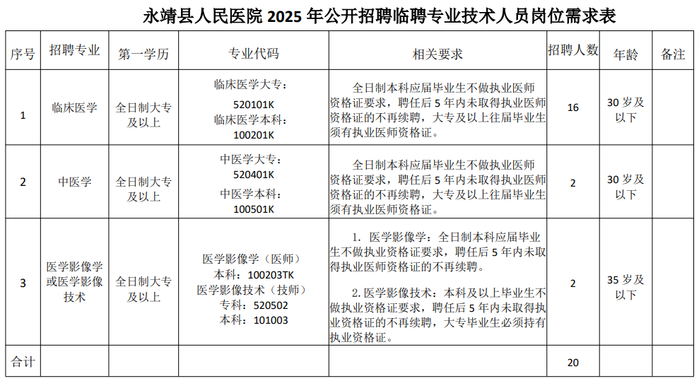 甘肃河州一家人力资源服务有限公司 2025年9月17日 标签: 永靖县人民医院 2025年招聘 临聘专业技术人员 医院招聘公告 医疗专业人才  |