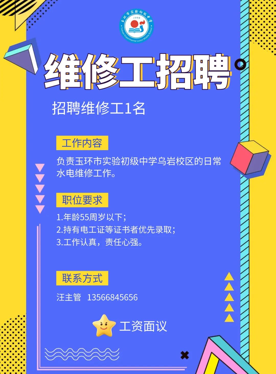 标签: 玉环市实验初级中学 招聘水电维修工 水电维修 初级中学招聘 教育机构招聘 维修工职位