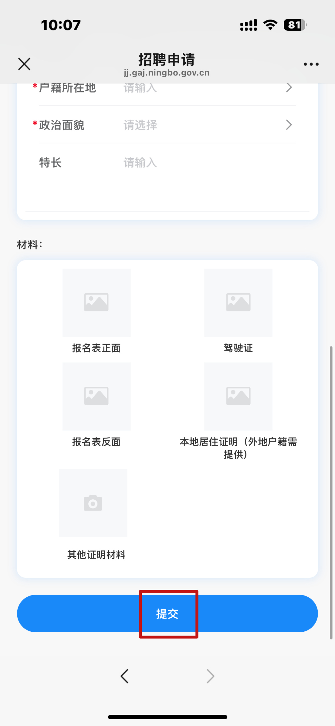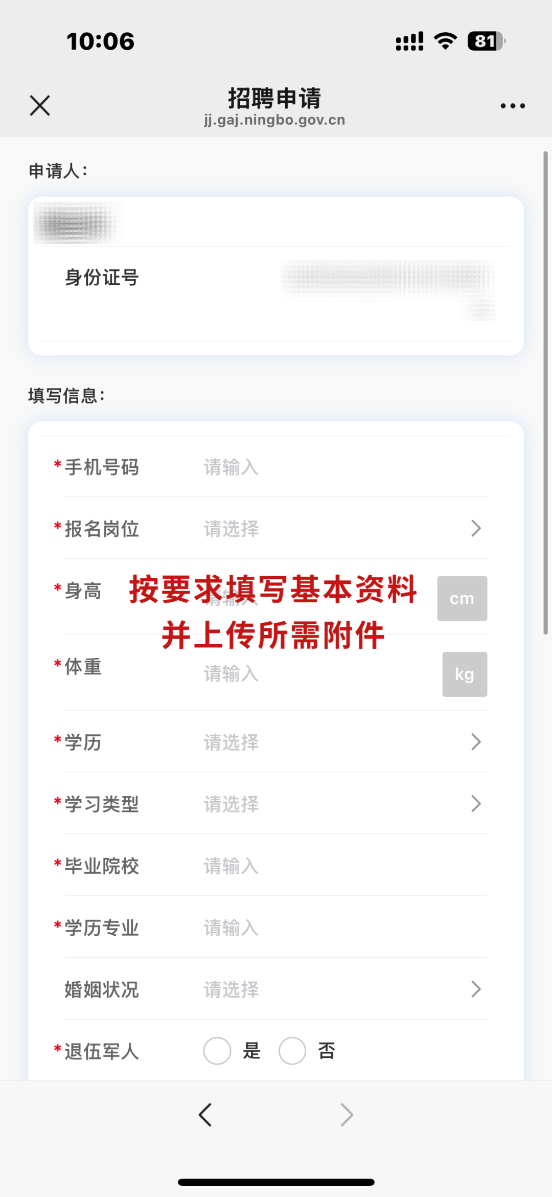 宁波市公安局面向社会公开招聘警务辅助人员公告 因工作需要,宁波市公安局面向社会公开招聘警务辅助人员(以下简称辅警)。招聘工作坚持公开、公平、择优的原则,按照报名、资格审查、体能测评、心理测评、笔试、面试、体检、政治考核、公示等程序组织实施,接受社会监督。现将有关事项公告如下: 01招聘岗位 宁波市公安局交通管理支队辅警46名(详见附件1)。 02招聘条件 (一)基本条件: 1.具有中华人民共和国国籍; 2.拥护中国共产党领导,拥护《中华人民共和国宪法》,遵守法律法规,热爱公安事业,品行端正; 3.男性,18-35周岁; 4.自愿从事警务辅助工作,具有忠诚、奉献、吃苦耐劳的精神,服从组织分配; 5.具备履行职责所需要的身体素质、工作能力、专业资质或专业技能; 6.具备拟聘岗位所要求的资格条件; 7.法律、法规规定的其他条件。 (二)资格条件(详见附件1): 1.文职辅警:本科及以上学历。 2.勤务辅警:大专及以上学历。 以上岗位同等条件下退役军人可以优先录取。烈士遗属,因公牺牲军人、人民警察、辅警的遗属,见义勇为人员、国家综合性消防救援队伍转退的救援人员应聘勤务岗位,可以适当放宽学历至高中(中专),并可以优先录取,但应当在聘用合同期限内取得岗位要求的学历,未取得的,合同期满后不予续签。 (三)不得报考的情形: 1.本人或家庭成员、主要社会关系人参加非法组织、邪教组织或者从事其他危害国家安全活动的; 2.本人或家庭成员、主要社会关系人正在服刑或正在接受调查的; 3.受过刑事处罚或者涉嫌违法犯罪尚未查清的; 4.曾编造、散布有损国家声誉、反对党的理论和路线方针政策、违反法律法规信息的; 5.曾因吸毒、赌博、卖淫嫖娼、故意伤害、寻衅滋事、酒后驾驶机动车等行为受到行政处罚的; 6.曾被行政拘留、司法拘留或收容教育的; 7.曾被吊销律师、公证员执业证书的; 8.曾被开除中国共产党党籍、中国人民解放军军籍的; 9.因违法违纪被国家机关、事业单位开除公职、辞退或者解除劳动关系的; 10.从事警务辅助工作合同期未满擅自离职的; 11.被依法列为失信联合惩戒对象的; 12.其他不适宜从事警务辅助工作的情形。 点击视频查看详细辅警招聘流程 03报名程序 (一)报名时间: 即日起至10月22日17:00止。 (二)报名方式: 1.线上预报名:关注“宁波交警”微信公众号,在个人中心实名认证,进入“警民互动”板块,点击菜单最下面“人员招聘”,按要求填写基本资料并上传所需附件。审核结果会在5个工作日内完成并短信通知。每人限报一个岗位,注明是否接受岗位调剂。 2.线下递交材料:资格审查结束后,会指定具体时间和地点,线下递交纸质报名材料。 ![]() ![]() ![]() ![]() ![]() ![]() ▲左右滑动查看全部 报名咨询电话:0574-87856055,王老师。 受理时间:工作日9:00-11:30,14:00-17:00。 04资格审查和体能测评 (一)资格审查: 主要审查应聘人员是否符合资格条件。应聘人员应按照通知要求准时到指定地点(另行通知),并携带以下材料: 1.本人和家庭成员户口簿复印件,身份证、毕业证原件及复印件; 2.中国高等教育学生信息网在线验证报告或电子学历注册备案(http://www.chsi.com.cn/); 3.中国人民银行的个人信用报告; 4.近期一寸免冠彩色照片一张; 5.退役士兵需提供退出现役证书原件及复印件; 6.《宁波市公安机关应聘警务辅助人员报名表》(附件2,A4纸正反面打印,格式不得变动),应聘者声明手抄一遍并签名。 资格审查不合格,或提交材料信息不实,影响资格审查结果的,不予进入体能测评环节。 (二)体能测评: 资格审查合格的应聘人员,参加体能测评,测评结果当场公布,任一项目不达标的,视为体能测评不达标,取消笔试资格。 体能测评项目为:纵跳摸高、10米×4往返跑、1000米跑,测评标准见附件3。 体能测评的时间、地点及相关安排另行通知。 05心理素质测评和笔试 (一)心理素质测评 心理素质测评主要是对职业抗压能力的测试,委托第三方进行线上答题,采用合格制,不计入总成绩。 (二)笔试: 笔试主要内容为时事政治、基本法律知识、行政能力、书面表达、专业素养等,采用机考方式进行,题型分为判断题、选择题、简答题、写作题,满分100分。笔试合格分数线由宁波市公安局交通管理支队统一划定。 心理素质测评和笔试时间于体测结束后另行通知。 06面试 (一)入围面试: 根据心理测评结果和笔试成绩确定入围面试人员。 (二)面试安排: 面试人员须携带有效期内的二代居民身份证参加面试,否则视为自动放弃。面试时间、地点另行通知。 (三)面试成绩: 面试成绩实行百分制,满分为100分,四舍五入保留小数点后2位。面试合格分数线由宁波市公安局交通管理支队统一划定。 07考试总成绩 考试总成绩=笔试成绩×40%+面试成绩×60%,并四舍五入保留小数点后2位。总成绩合格分数线由宁波市公安局交通管理支队统一公布,若同一岗位考生总成绩相同,则依次按照笔试成绩、男子1000米成绩确定名次。 08体检、政治考核和公示 (一)体检: 总成绩合格的应聘人员,根据总成绩高低顺序,按岗位拟招聘人数1:1比例确定参加体检人员(考试测评合格人数低于岗位数的以实际合格人数安排体检)。体检安排另行通知。体检标准见附件4。 (二)政治考核: 对体检合格人员参照人民警察政治考察要求进行政治考核。内容主要包括政治思想、道德品质、能力素质、现实