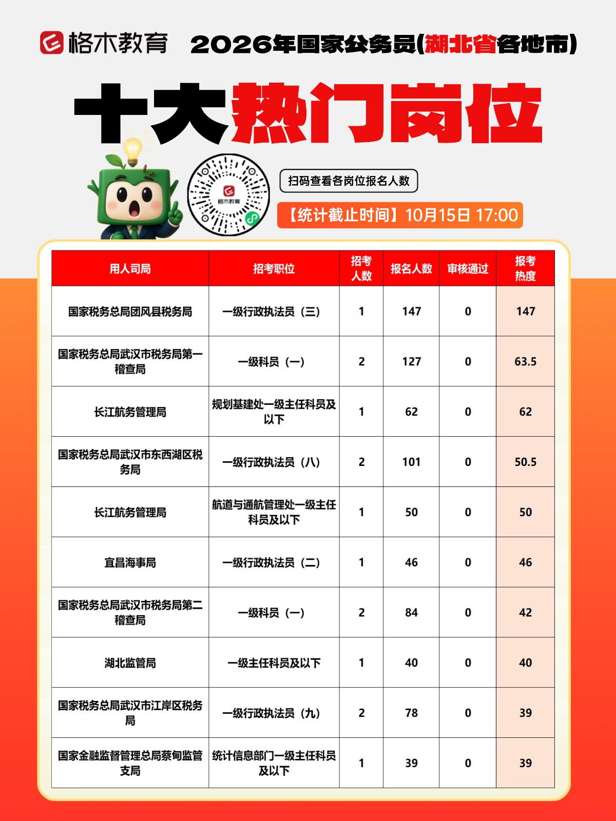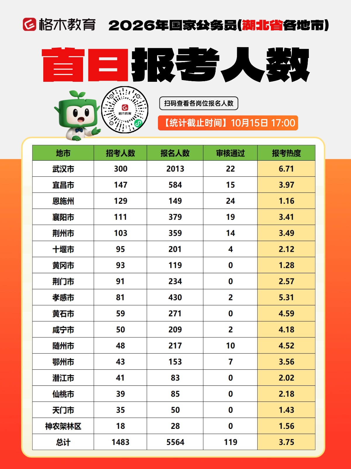| 2026国家公务员考试共计招录3.81万人,考生可于10月15日8:00至10月24日18:00期间登录“中央机关及其直属机构2026年度考试录用公务员专题网站”(http://bm.scs.gov.cn/kl2026)进行网上报名,公共科目笔试将于11月30日在全国各直辖市、省会城市、自治区首府和部分城市同时举行。 2026年国考首日报名人数统计:截至10月15日17时,湖北招录1483人,报名人数5564人,审核通过119人。