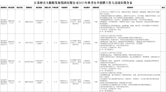 招聘单位、岗位及相关要求等内容,详见附件1《江苏钟吾大数据发展集团有限公司2025年秋季公开招聘工作人员》(以下简称《岗位表》)。 二、报考基本条件 (一)具有中华人民共和国国籍; (二)遵守中华人民共和国宪法、法律,拥护中国共产党领导和社会主义制度; (三)认同企业文化,愿意遵守公司规章制度和履行员工义务; (四)具有良好的职业操守以及正常履职的心理素质和身体条件; (五)年龄在18周岁以上,38周岁以下(1986年10月至2007年10月期间出生),43周岁以下(1981年10月至2007年10月期间出生)。 (六)具备招聘岗位要求的其他资格和条件。 1.专业设置。招聘条件中“专业”的设置目录为《江苏省2025年度考试录用公务员专业参考目录》(以下简称“专业参考目录”)。 2.招聘条件中工作经历计算的截止时间为2025年10月31日。 (七)港澳台相关人员报考的,按国家、省有关规定执行。 (八)招聘岗位中要求专业技术资格证书、学历学位证书等条件,除有特殊要求以外的,须于报名开始之日前取得。 (九)招聘对象中“条件优秀的应聘人员”是指:具有博士学历;全国“双一流”高校毕业并已取得学历(学位)证书;具有相关岗位工作经验满5年及以上。 (十)全国“双一流”毕业生(不含委培、定向、专升本、独立学院毕业生和在职研究生)。应聘人员最高学历毕业学校属于第二轮“双一流”建设高校(“双一流”建设高校名单以《关于公布第二轮“双一流”建设高校及建设学科名单的通知》(教研函〔2022〕1号)为准),详见附件2。 (十一)有下列情形之一的,不得报考: 1.现役军人; 2.在读的全日制普通高等学校学生; 3.因犯罪受过刑事处罚的人员,曾被开除公职、党籍、高等教育学籍的人员,被依法列为失信联合惩戒对象的人员; 4 .国家或省市另有规定不得到有关岗位工作的人员。 三、报名安排 (一)发布招聘公告 通过“钟吾大数据集团”官网(https://www.zwbdata.com)、微信公众号【钟吾大数据集团】、“迁宿迁直聘网”官网(https://www.qsqjob.com)、微信公众号【迁宿迁直聘网】等媒体向社会公开发布本次招聘岗位信息。 (二)网络报名与资格初审 本次招聘的报名、资格初审和缴费,均采用线上方式。 1.网络报名 报名、照片上传时间:自简章发布之日起至2025年11月5日12:00。 报名网址:登录“迁宿迁直聘网”官网(https://www.qsqjob.com),点击首页“江苏钟吾大数据发展集团有限公司2025年秋季公开招聘工作人员报名入口”。 2.资格初审与陈述申辩 资格初审时间:自简章发布之日起至2025年11月5日15:00; 陈述申辩时间:自简章发布之日起至2025年11月5日16:00。 3.缴费确认 考生通过资格初审、照片审核后进行网上缴费,报名费用为100元/人。完成缴费确认后,视为通过该岗位网上报名。 缴费时间:自简章发布之日起至2025年11月5日17:00。 (三)报名注意事项 1.报考者应当仔细阅读网上诚信报名协议,按照岗位要求和网上报名系统提示,如实、准确、完整地填写有关信息,并上传本人近期免冠正面2寸(35×45毫米)电子证件照片(jpg格式,大小为500kb以下)。 报考者提供虚假报考材料的,一经查实,即取消报考资格。对伪造、变造有关证件、材料、信息,骗取考试资格的,将按照有关规定严肃处理。 2.考生只能用有效期内的二代身份证选择一个岗位进行报名,报名与考试时使用的有效居民身份证必须一致,否则取消考试资格。报名期间,资格审查未通过的,可以改报其他符合条件的岗位。 3.报考者网上提交报名信息48小时后,可在报名网站查询资格初审结果。通过资格初审的,不得再报考其他职位。未进行缴费的考生,视为报名未通过。 4.报名结束后,对报名人数达不到1:3开考比例的岗位,可相应核减直至取消招聘计划,已报考被取消岗位的人员,可重新补报其他符合条件的岗位,补报名时间:2025年11月6日9:00至11月6日16:00。 (四)网上打印准考证 通过缴费确认后的应聘人员须按规定时间到原报名网站下载并打印《准考证》,打印准考证时间以后续通知为准。 四、招聘程序 (一)笔试 1.笔试内容:主要考察岗位所需专业知识和综合素质能力等,不指定辅导用书。 2.笔试安排:各岗位招聘计划数与报名成功人数之比达到1:3后组织笔试。报名人数未达开考比例的,经研究后可延长报名时间或核减招聘岗位,以最终公告为准。笔试时间和地点等内容在“钟吾大数据集团”官网(https://www.zwbdata.com)、微信公众号【钟吾大数据集团】、“迁宿迁直聘网”官网(https://www.qsqjob.com)、微信公众号【迁宿迁直聘网】。 考生应当携带准考证和有效期内二代身份证,按照规定的时间和地点参加笔试。考生参加考试时持有的身份证必须与报名时所使用的身份证姓名、居民身份证号码相一致。 3.成绩查询:笔试成绩以百分制形式在“钟吾大数据集团”官网(https://www.zwbdata.com)、微信公众号【钟吾大数据集团】、“迁宿迁直聘网”官网(https://www.qsqjob.com)、微信公众号【迁宿迁直聘网】发布。 (二)资格复审 1.确定资格复审人选:根据应聘人员笔试成绩,从高分到低分按岗位招聘计划数3倍的比例(末位成绩并列的应聘人员一同进入)确定参加资格复审人选。如人数与招聘计划数之比不足3:1的,可按实际进入人数参加复审。 2.资格复审时间及地点:具体要求在“钟吾大数据集团”官网(https://www.zwbdata.com)、微信公众号【钟吾大数据集团】、“迁宿迁直聘网”官网(