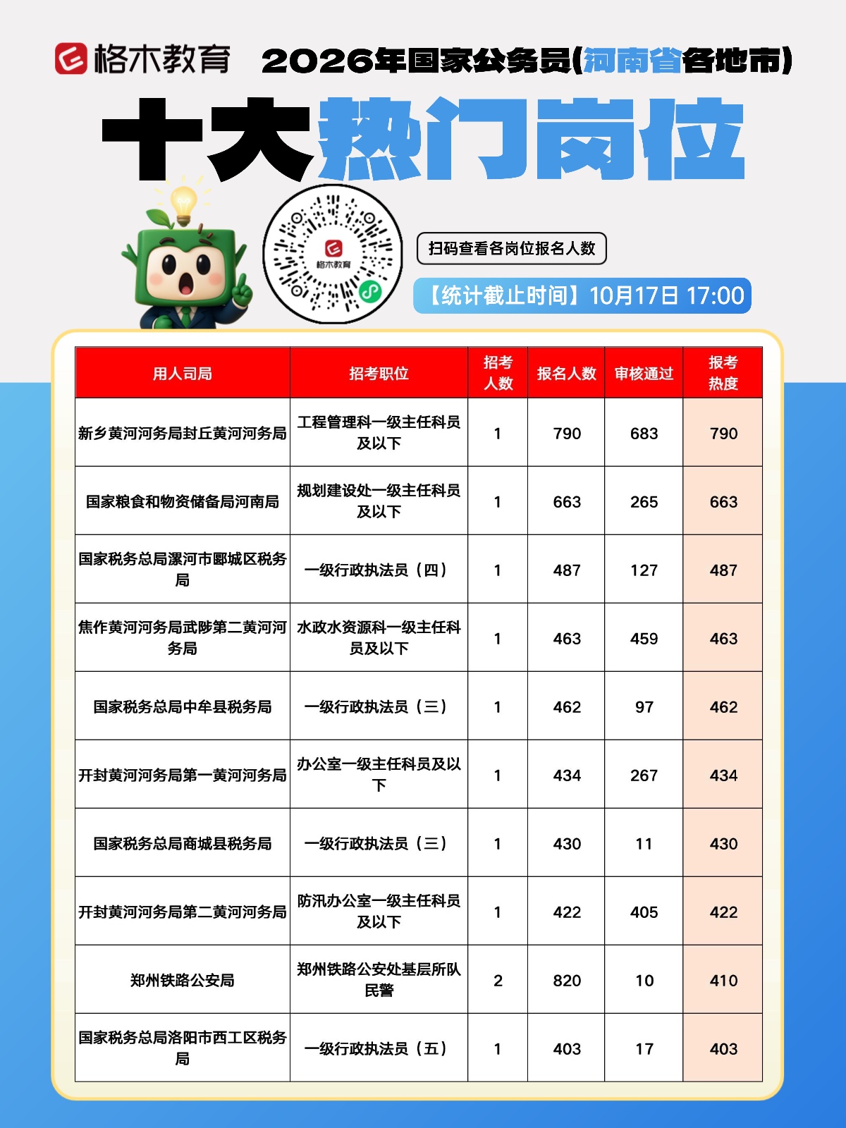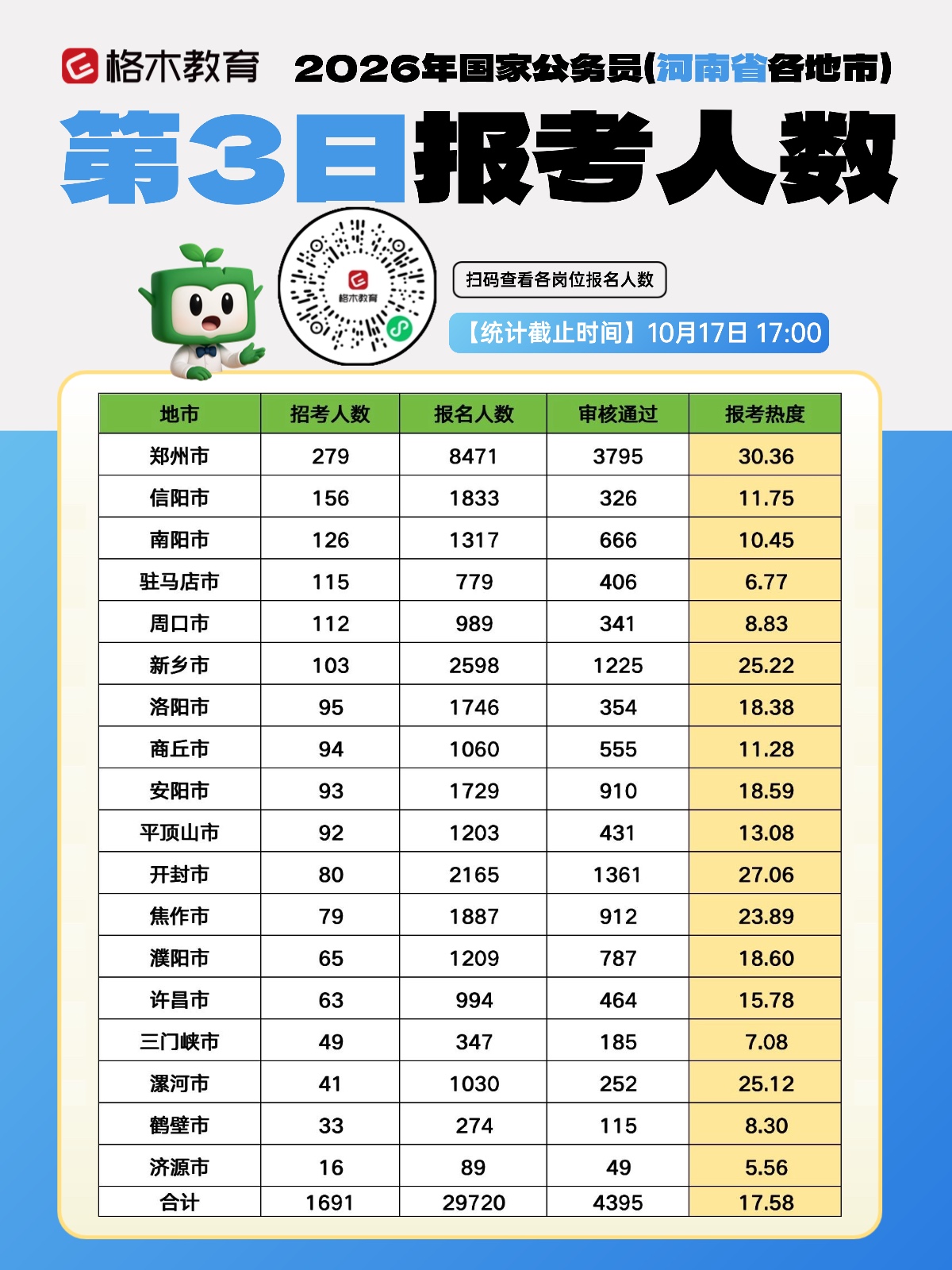 | 2026国家公务员考试共计招录3.81万人,考生可于10月15日8:00至10月24日18:00期间登录“中央机关及其直属机构2026年度考试录用公务员专题网站”(http://bm.scs.gov.cn/kl2026)进行网上报名,公共科目笔试将于11月30日在全国各直辖市、省会城市、自治区首府和部分城市同时举行。 2026年国考首日报名人数统计:截至10月16日17时,河南招录1691人,报名人数29720人,审核通过13134人。