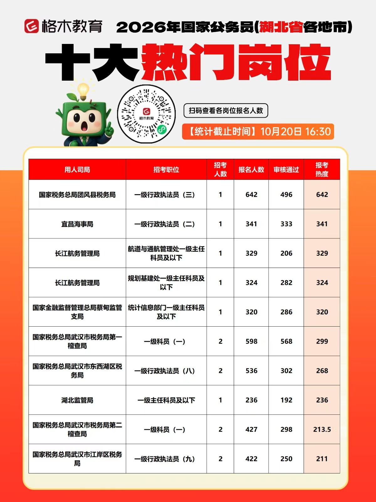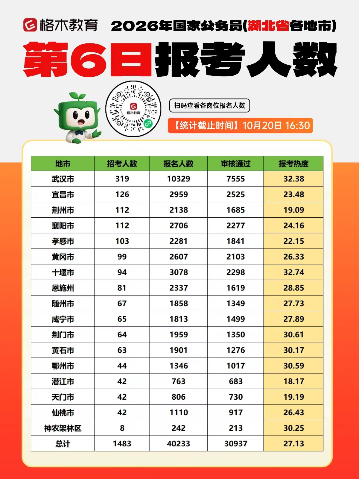| 2026国家公务员考试共计招录3.81万人,考生可于10月15日8:00至10月24日18:00期间登录“中央机关及其直属机构2026年度考试录用公务员专题网站”(http://bm.scs.gov.cn/kl2026)进行网上报名,公共科目笔试将于11月30日在全国各直辖市、省会城市、自治区首府和部分城市同时举行。 2026年国考报名人数统计:截至10月20日16:30时,湖北招录1483人,报名人数40233人,审核通过30937人。