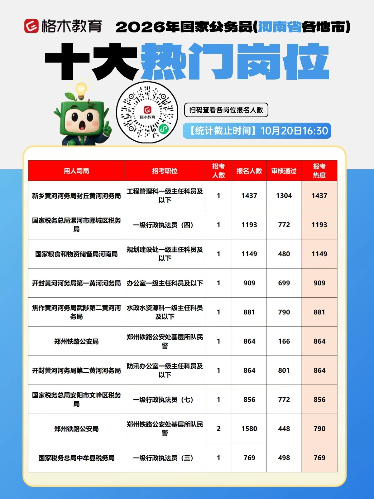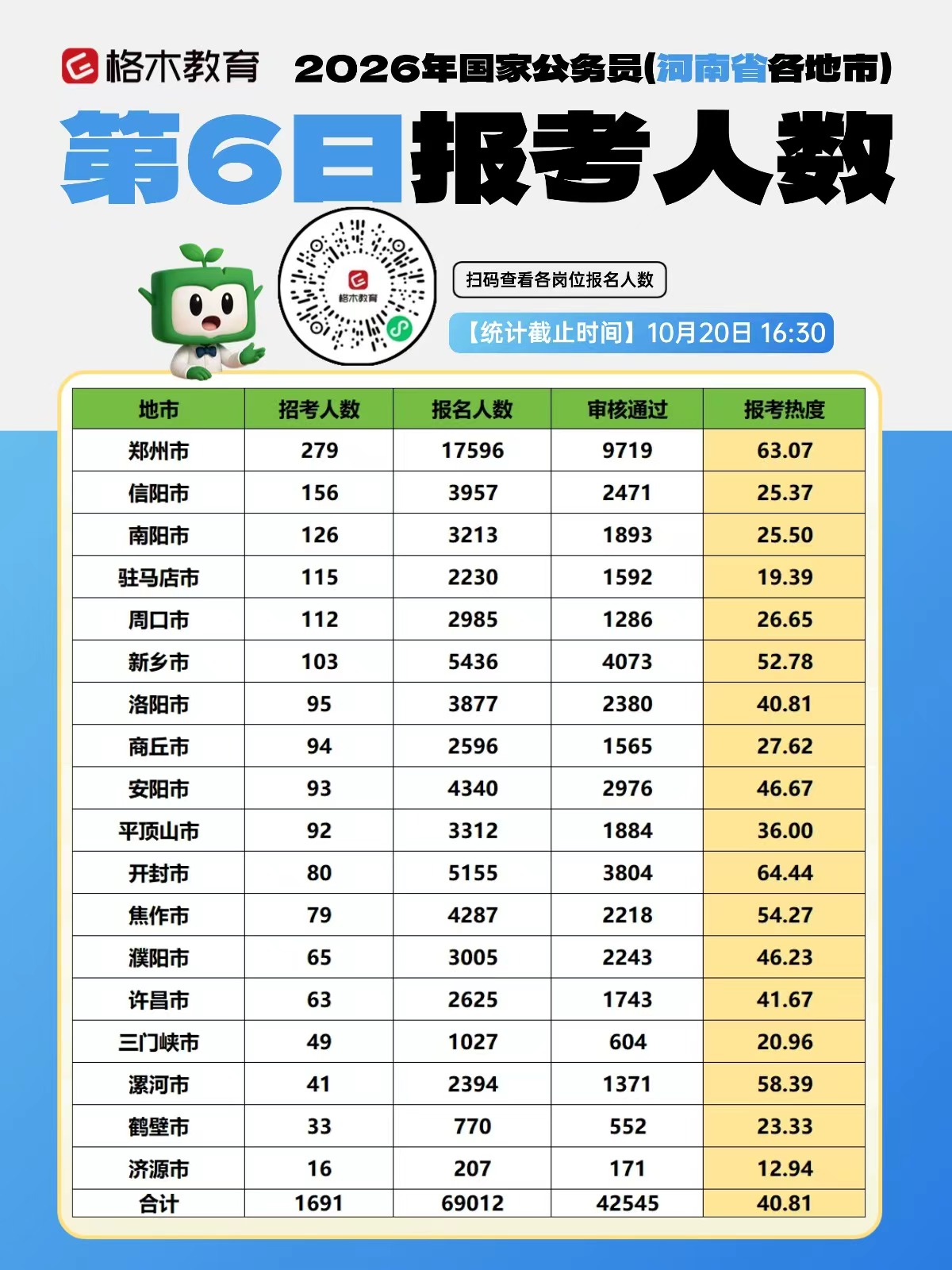 | 2026国家公务员考试共计招录3.81万人,考生可于10月15日8:00至10月24日18:00期间登录“中央机关及其直属机构2026年度考试录用公务员专题网站”(http://bm.scs.gov.cn/kl2026)进行网上报名,公共科目笔试将于11月30日在全国各直辖市、省会城市、自治区首府和部分城市同时举行。 2026年国考报名人数统计:截至10月20日16:30时,河南招录1691人,报名人数69012人,审核通过42545人。