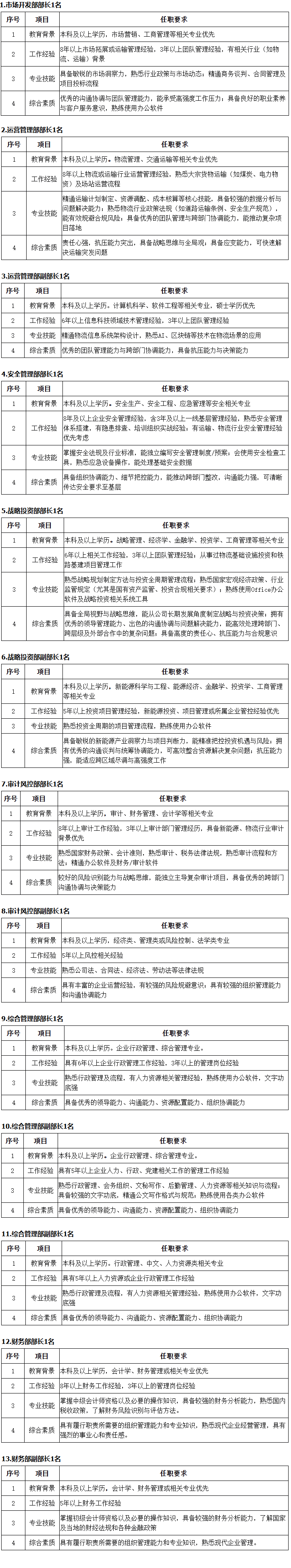 | 一、公司简介 新疆恒泰智慧能源股份有限公司成立于2020年6月,注册资本3.64亿元。2025年4月,公司完成战略重组,正式并入兵团国资委下属国企中新建物流集团。公司依托新疆地缘及区位优势,聚焦大宗商品物流与智慧供应链服务,构建物流储运、农特产品冷链、新能源开发等多板块协同发展格局,为客户提供全链条一体化解决方案。公司以科技为驱动,深度融合大数据、人工智能技术,打造智能化、数字化运营体系,在煤焦、化工、建材等大宗商品领域,与众多国企、央企建立长期战略合作,有力推动 “一带一路” 现代物流体系建设。在新能源领域,公司前瞻布局换电重卡、光伏发电、储能等业务,全力构建绿色低碳运输网络,抢占“双碳”时代发展先机。目前,公司旗下拥有3家国企混改企业、6家供应链管理公司及多家专业子公司,运营疆内6条专用线场站,实现供应链服务全程贯通,经济效益与社会效益显著。展望未来,恒泰股份将深化大数据、区块链等新技术应用,推动商流、资金流、物流、信息流“四流合一”,构建大宗商品产业互联网生态平台,持续提升国际物流服务能力与资源整合效能,矢志成为国内一流的大宗货物物流供应商与行业标杆企业,以责任担当创造更大社会价值。 此次公开招(竞)聘共涉及公司本部13个中层管理岗位,计划录用人数13人。将严格遵循“公开、平等、竞争、择优”原则,通过报名、资格审查、笔试、面试、综合评估等环节,面向社会广泛选拔专业能力突出、经验丰富的优秀人才。 二、竞聘工作原则 1.公平公正公开:严格统一标准,公示竞聘流程、评分细则及结果,接受社会监督。 2.德才兼备择优:综合考察职业道德、专业素养、工作实绩与创新能力。 3.程序规范严谨:严格执行报名、资格审查、笔试、面试、综合评估等流程。 4.注重发展潜力:评估学习能力、应变能力与长期发展潜力,储备战略人才。 三、竞聘人员基本条件 1.政治素养达标:始终坚守对党忠诚的政治立场,理想信念根基扎实;具备出色的政治领悟及政治执行能力。 2.职业操守合规:拥有强烈的事业责任感与工作使命感,恪守法律法规与廉洁从业准则,秉持诚信勤勉的工作态度;能严格执行公司各项会议决议,主动维护公司权益,在职业行为与行业信誉方面无不良记录。 3.专业能力适配:掌握履行目标岗位职责必备的专业知识体系与实操能力,掌握行业监管政策及相关法律条款,了解行业发展方向;熟悉现代企业运营管理机制,具备扎实的企业管理实践经验。 4.身心素质良好:具备能够支撑高强度工作的身体健康条件,拥有积极稳定的职业心态,心理调适与抗压能力较强 四、公开竞聘岗位、人数及任职要求