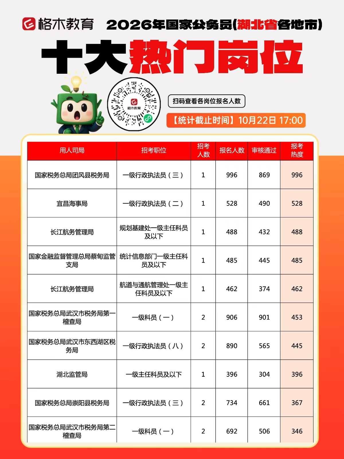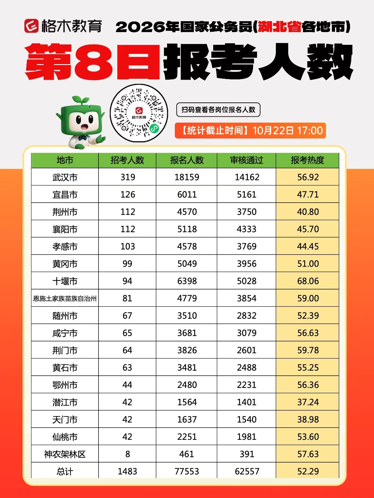 | 2026国家公务员考试共计招录3.81万人,考生可于10月15日8:00至10月24日18:00期间登录“中央机关及其直属机构2026年度考试录用公务员专题网站”(http://bm.scs.gov.cn/kl2026)进行网上报名,公共科目笔试将于11月30日在全国各直辖市、省会城市、自治区首府和部分城市同时举行。 2026年国考报名人数统计:截至10月22日17:00时,湖北招录1483人,报名人数77553人,审核通过62557人。