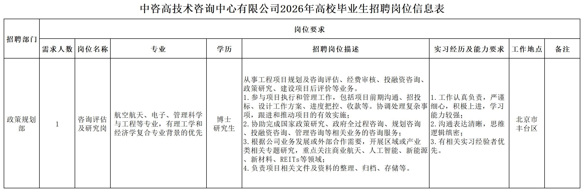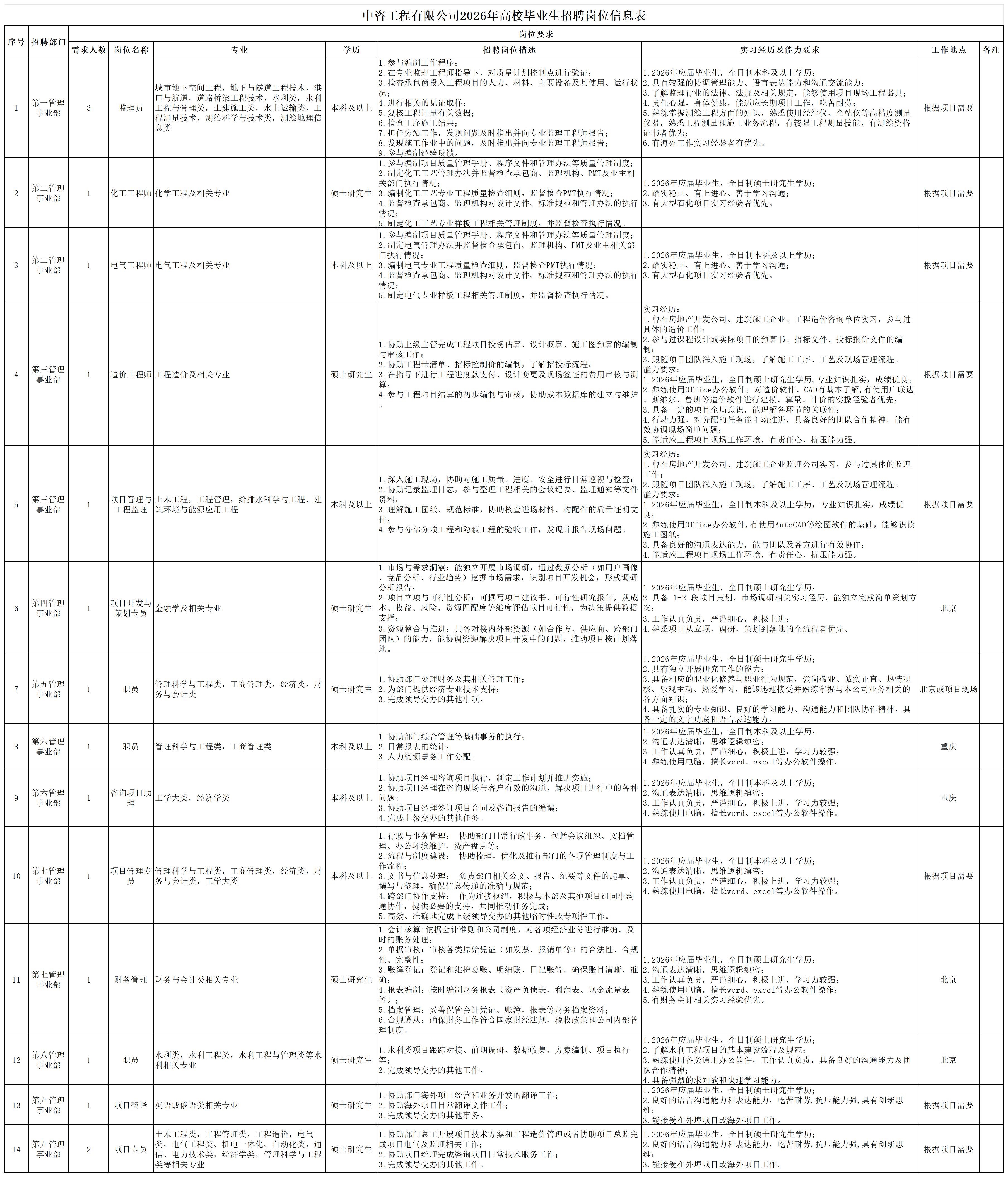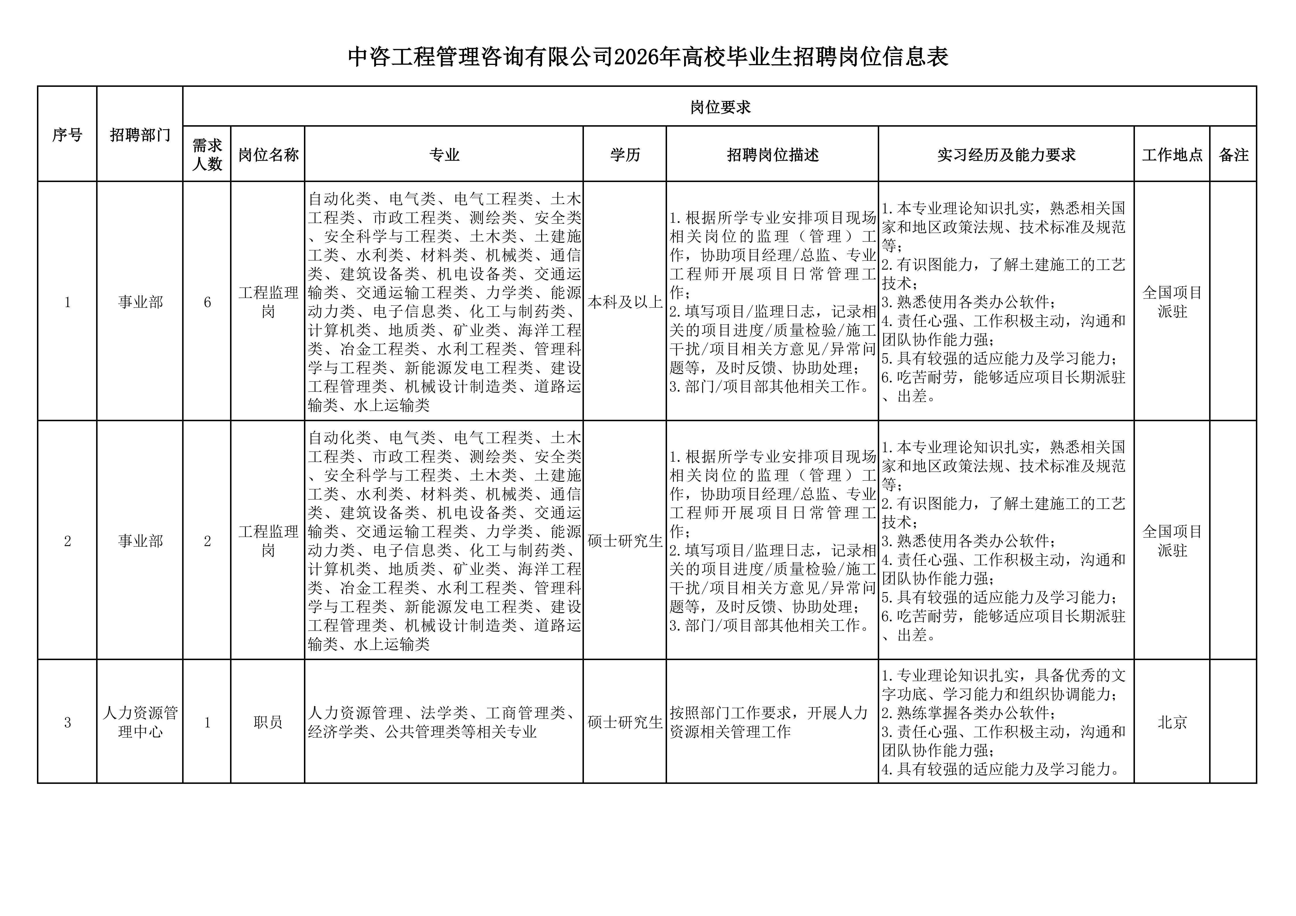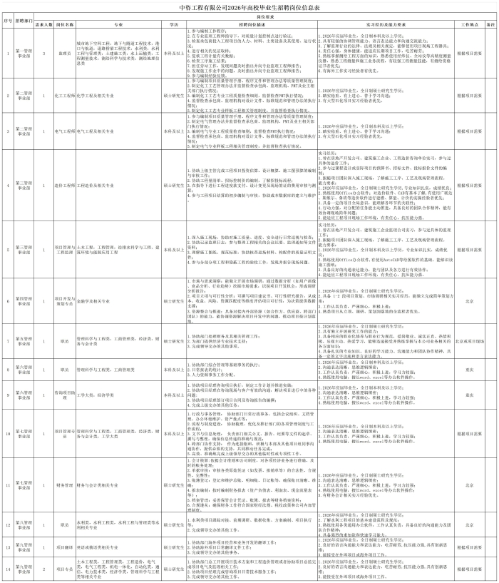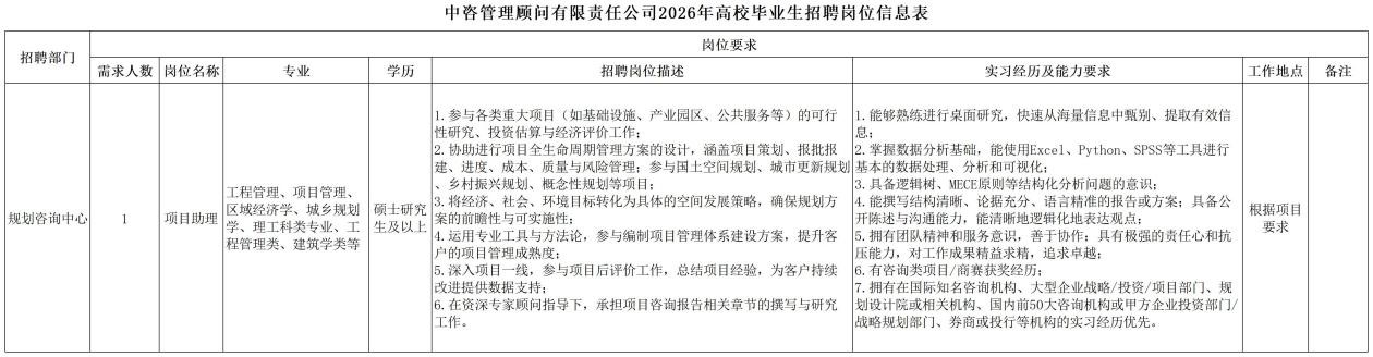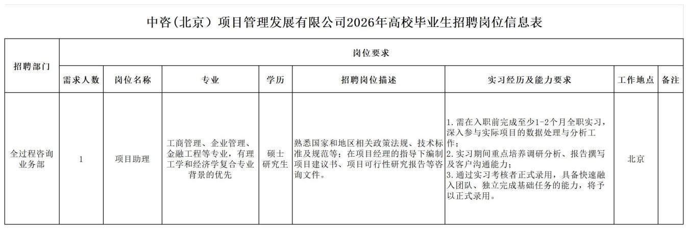 | 中咨工程管理咨询有限公司 一、公司简介 中咨工程管理咨询有限公司(简称中咨管理)成立于1989年,是中国国际工程咨询有限公司的核心骨干子公司,注册资金1.55亿元。现有各项资质证书持证2800余册,中高级职称比例超50%。 中咨管理公司是国内从事工程管理类业务最早、规模最大、行业最广、业绩最多的企业之一,具有工程咨询甲级资信、工程监理综合资质以及设备、公路工程、地质灾害防治工程、人民防空工程等多项专业监理甲级资质,并列入政府采购招标代理机构和中央投资项目招标代理机构名单。业务涵盖工程前期咨询、项目管理、项目代建、招标代理、造价咨询、工程监理、设备监理、设计优化、工程质量安全评估咨询等项目全过程咨询服务,涉及房屋建筑、交通、石化、水利、电力、冶炼、矿山、市政、生态环境、通信和信息化等多个行业。业务遍布全国及全球近50个国家和地区,累计服务各类咨询管理项目超过1万个,涉及工程建设投资近5万亿元。曾荣获56项中国建设工程鲁班奖、15项中国土木工程詹天佑奖、64项国家优质工程奖、23项中国钢结构金奖以及各类省级或行业奖项500余项。 经过30余年的不懈努力,我们积累了丰富的工程管理经验,为各类工程建设项目保驾护航,“中咨管理”品牌成为行业的一面旗帜。我们崇尚简单、包容、共享的理念,秉持创造价值、贡献社会的使命和专业创造精品、价值成就客户的核心价值观,为成为全过程工程管理咨询的领先者而奋斗。优秀的你值得更好的平台,加入我们,携手共创新篇章! 二、应聘条件 (一)2026年全日制本科及以上应届毕业生。 (二)年龄要求:本科生26周岁及以下(2000年1月1日后出生),硕士研究生30周岁及以下(1996年1月1日后出生)。 (三)在校就读期间无在职工作经历,无社保缴纳记录和派遣落户记录。 (四)成绩优秀,人品端正,积极进取,愿与公司共改革、奋进。 (五)具备扎实的专业理论知识和良好的沟通能力,实践能力较强。 (六)熟练使用各类办公软件。 (七)简历需注明出生日期、生源地(即入学前户籍所在地)。 三、应聘程序 发布招聘公告→简历投递→简历筛选→笔试→面试→确定人选并公示→发放录用通知。 四、岗位信息 五、报名方式 本次招聘报名采取在线填报方式进行:应聘者请使用Chrome内核浏览器(如:Chrome浏览器、360浏览器、百度浏览器、搜狗浏览器、UC浏览器等)登录网站报名,网站链接:https://hcmcloud.ciecc.com.cn/recruit/#/index 或使用手机扫描二维码: 中咨工程有限公司 一、? 公司简介 中咨工程有限公司成立于2010年,是中国国际工程咨询有限公司(简称中咨公司)的控股子公司,由中咨公司和中国广核电力股份有限公司合资成立。 公司作为中咨公司工程管理业务板块的核心成员,主营业务为全过程工程管理(咨询)服务业务,包括全过程中的各节点业务(1+X),业务范围涉及石化、核电、冶金、交通和民用市政等多个领域行业工程项目的前期咨询及咨询管理、勘察管理、设计管理、监理、采购管理、造价咨询、建造过程管理、项目管理(IPMT、PMC等)、项目代建和技术服务等。 公司以为国家、社会和股东创造价值为己任,以两大股东提供的广阔市场机遇和成熟先进的管理体系为发展驱动力,通过积极参与市场竞争,努力培育公司核心竞争能力,打造一支特别能战斗的具有复合型人才的专业化队伍,矢志发展成为具备承接大中型全过程工程管理(咨询)服务业务能力的、具有国际竞争力的工程公司。 二、? 应聘条件 (一)2026年全日制本科及以上应届毕业生(部分岗位硕士研究生学历),在校就读期间无在职工作经历,无社保缴纳记录和派遣落户记录,学习成绩优良。 (二)良好的语言表达能力和沟通能力,执行力强,学习能力强,协作能力强。 (三)身体健康,具有良好的职业道德修养,具有较强的责任心。 (四)熟练使用常用办公软件,具有一定的文字功底。 (五)无违规违法记录,无不良嗜好,身体素质好,能吃苦耐劳,能承受较大的工作压力。 三、? 招聘程序 发布招聘公告→简历筛选→资格审查→综合能力测评→面试→确定人选并公示→发放录用通知→入职。 四、? 岗位信息 五、? 报名方式 本次招聘报名采取在线填报方式进行:应聘者请使用Chrome内核浏览器(如:Chrome浏览器、360浏览器、百度浏览器、搜狗浏览器、UC浏览器等)登录网站报名,网站链接:https://hcmcloud.ciecc.com.cn/recruit/#/index 或使用手机扫描二维码: 中咨海外咨询有限公司 一、公司简介 中咨海外咨询有限公司是中国国际工程咨询有限公司所属二级子公司,于1988年成立,经过30多年发展,为各级政府、企事业单位提供了万余项咨询服务,在国内咨询领域具有一定知名度和较高信誉,具备较好的发展基础。2021年入选国资委“管理标杆”企业,2022-2025年连续4年蝉联国资委“双百行动标杆”企业。 公司主要从事战略谋划、投资策划、全过程咨询以及规划设计和建设投资管理经营五大业务。善于谋划策划创造发展新优势,努力成为工程建设领域原创思想策源地;善于科学设计项目功能成本方案,致力成为国内优化设计领域先行者;善于系统提供区域发展整体解决方案,努力成为国内有影响力的具有研究特质的咨询设计企业。公司为国家高新技术企业,拥有工程咨询行业综合甲级资信、15项专业专项甲级资信;公路、建筑、市政行业7项专业甲级设计