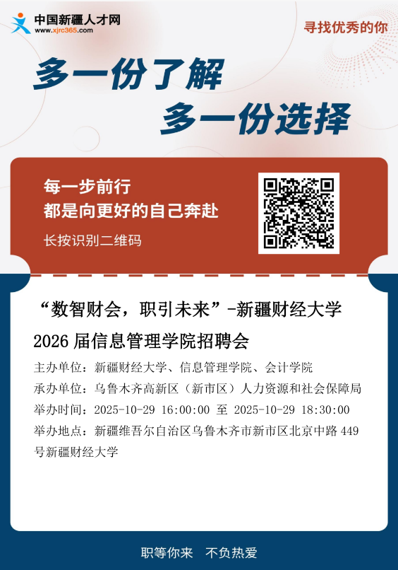 | “数智财会,职引未来”-新疆财经大学2026届信息管理学院招聘会 主办单位:新疆财政大学、信息管理学院、会计学院 时间:2025年10月29日(周三)16:00-18:30 举办场地:新疆财经大学新食堂五楼 地址:疆维吾尔自治区乌鲁木齐市新市区北京中路449号新疆财经大学 注:本场招聘会主要是信息管理学院、会计学院的毕业生参加