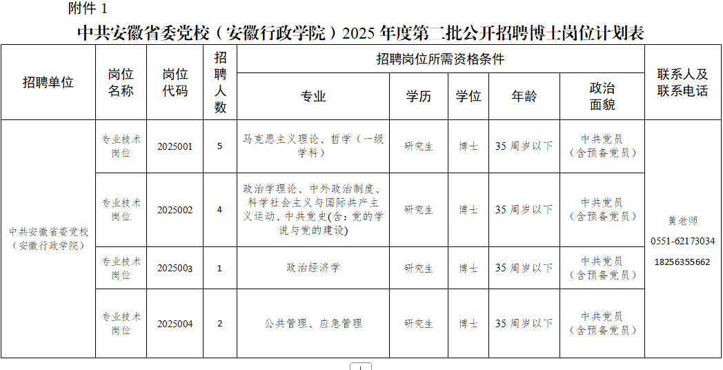 中共安徽省委党校(安徽行政学院)2025年度第二批公开招聘博士公告 根据《关于进一步做好事业单位公开招聘工作的通知》(人社部发〔2024〕57号)、《安徽省事业单位公开招聘人员暂行办法》(皖人社发〔2010〕78号)等文件精神,为做好2025年度第二批公开招聘博士工作,公告如下。 一、招聘原则 (一)坚持面向社会、公开公正。 (二)坚持面试考察、择优聘用。 (三)坚持组织严密、程序规范。 二、招聘计划 经省委组织部、省委编办、省人社厅核准,校(院)面向社会公开招聘博士12人(详见附件1)。 三、招聘条件 (一)招聘对象 年龄35周岁以下(1989年11月以后出生)博士研究生,中共党员(含预备党员),全国普通高等学校博士研究生(现役军人不属于本次招聘范围)。且符合下列各项条件: 1.具有中华人民共和国国籍,遵守宪法和法律法规; 2.政治立场坚定,坚定拥护“两个确立”、坚决做到“两个维护”,在思想上政治上行动上同以习近平同志为核心的党中央保持高度一致; 3.拥护中国共产党的领导和社会主义制度,热爱党的干部教育培训事业,品行端正,学风严谨; 4.具有较强的科研能力和符合党校(行政学院)教学要求的成果基础,具备良好的教研发展潜力; 5.身体健康,能够胜任教研岗位工作。 (二)有下列情形之一的人员,不得报考 1.不符合招聘岗位条件要求的人员; 2.被依法列为失信联合惩戒对象的人员; 3.在各级各类事业单位公开招聘中因违反《事业单位公开招聘违纪违规行为处理规定》被记入事业单位公开招聘应聘人员诚信档案库,且记录期限未满的人员; 4.曾因犯罪受过刑事处罚的人员和曾被开除公职的人员、受到党纪政纪处分期限未满或者正在接受纪律审查的人员、处于刑事处罚期间或者正在接受司法调查尚未做出结论的人员; 5.按照国家、安徽省有关规定,尚在最低服务年限内的机关、事业单位正式在编工作人员; 6.法律规定不得参加报考或聘用为事业单位工作人员的其他情形人员。 报考者不得报考聘用后即构成《事业单位人事管理回避规定》第六条所列情形的岗位。 四、招聘程序 (一)个人报名 1.报名时间 报名时间为2025年11月21日上午8:00至12月21日下午5:00(以邮件发送时间为准)。 2.报名材料 (1)《附件:中共安徽省委党校(安徽行政学院)公开招聘博士报名表》(word版,附件2)。应聘人员填写的信息必须与本人实际情况、报考条件和报考岗位要求相一致,业绩成果及获奖情况须提供佐证材料。 提交体现研究能力和学术水平的代表作2篇(部)(一般为代表性学术论文,也可以是学术性获奖、课题立项、咨政成果、著作等,论文需提供全文,著作提供目录和摘要,课题、奖励等提供证书和佐证材料) (2)本人有效居民身份证正反面扫描件。 (3)博士学历、学位证书扫描件。对于已修完教学计划规定全部课程、各科成绩合格、尚未取得博士学历学位证书的应聘人员,可凭学校出具的书面证明或毕业就业推荐表等材料报名。报名人员须于2026年7月31日前提交毕业证书、学位证书。 (4)党籍证明材料。 (5)机关、事业单位在职人员报考,须提供有人事管理权限的主管机关出具的同意报考证明;在站博士后报考,须提供所在的博士后管理部门出具的同意报考证明。 3.报名方式 网上提交报名材料,邮箱:ahdxzzrsc@163.com,邮件标题为“本人姓名+毕业学校+所学专业”。 4.联系电话 黄老师:0551-62173034,18256355662 (二)资格审查 资格审查贯穿招聘工作全过程。根据本公告规定的报名资格条件和招聘岗位要求,对报名人员进行资格审查,通过资格审查的应聘人员进入初试环节。 每个岗位资格审查合格的应聘人数与该岗位招聘计划数比例达不到2:1的,取消或相应核减该岗位录用计划数。 在规定时间内不能提交有效学历、学位证书原件,或原件与证明材料不一致的,视为不符合报名条件,取消专业测试或聘用资格。 资格现场审查时间、地点另行通知。 (三)初试环节 初试环节主要对应聘人员进行政治把关、专业能力和研究成果审核。 设定合格分数线80分,达到80分的应聘人员进入专业测试环节,比例达不到2:1的,取消或相应核减该岗位录用计划数。进入专业测试的人选名单及有关通知将在校(院)网站公布,未进入专业测试的名单不再另行通知。 (四)专业测试 1.组织方式 专业测试采取专业面试与综合考核相结合的方式。 专业面试分为试讲和答辩,总分100分。试讲主要测试应聘人员的教学内容与架构、运用教学方法与技能、教学效果、语言表达及仪表举止等;答辩主要测试应聘人员的逻辑思维、综合分析研判问题能力及发展潜质等,其中,答辩流程包括专家提问、现场答复、评议评分等环节。专业面试得分80分以上的,方能进入综合考核环节。 综合考核主要侧重于应聘人员的师德师风、学科背景、理论功底、专业素养、发展潜力等方面的综合评价,采取面谈的方式进行,总分100分,设置最低分数线80分。 专业面试顺序于试讲答辩当天现场抽签确定。 2.时间地点 专业面试时间和地点另行通知。参加专业面试的应聘人员须持本人有效身份证到指定地点参加面试。否则,视为自动放弃。 3.成绩合成 专业测试成绩满分为100分,其中,专业面试成绩占60%、综合考核成绩占40%。专业面试环节,考官按照试讲和答辩综合表现打分,去掉一个最高分和一个最低分后,取剩余有效分数的平均分,计算到小数点后两位数,尾