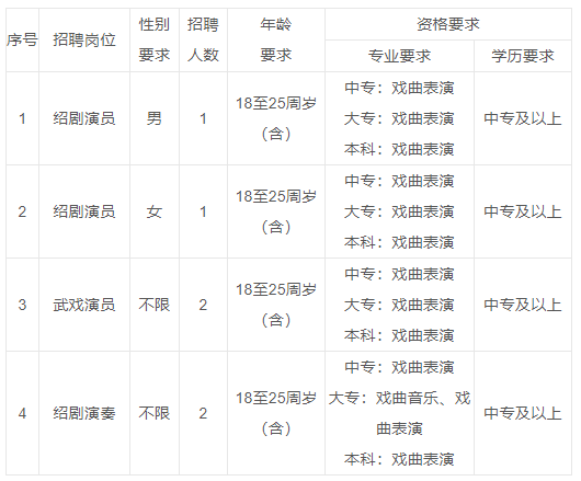 绍兴市文化广电旅游局2025年公开招聘浙江绍剧艺术研究院工作人员公告 浙江绍剧艺术研究院为相似正科级事业单位,经费财政差额拨款。因单位实际工作需要,决定公开招聘工作人员6名,现公告如下: 一、招聘条件 (一)基本条件 1.具有中华人民共和国国籍。 2.遵守中华人民共和国宪法、法律和法规。 3.具有良好的政治素养、道德品行和职业素养。 4.热爱绍剧艺术事业,具备岗位所需的专业技能和身体条件。 5.具备国家承认的中专及以上学历。国内毕业的要求在2025年12月31日前取得国家承认的国民教育系列学历、学位证书(其中大专及以上学历以中国高等教育学生信息网查询情况为准),国(境)外毕业的要求在2025年12月31日前取得教育部中国留学服务中心学历、学位认证证书。 6.年龄要求:18至25周岁(1999年11月13日至2007年11月12日期间出生)。 (二)存在下列情形之一的,不得报名: 1.因相应考试违规违纪行为被各级人事考试机构处罚且尚在禁考期内的。 2.受到诫勉、组织处理或者党纪政务处分等影响期未满,或者期满但影响使用的。 3.被依法认定为失信联合惩戒对象的。 4.聘用后即构成《事业单位人事管理回避规定》中规定的回避关系的。 5.法律、政策规定不得聘用为事业单位工作人员的其他情形。 二、招聘岗位 ![]() 注:中专学历专业以《2021版中等职业教育专业目录(2024年1月更新)》为准,大专及以上学历专业以《2025年浙江省公务员录用考试专业参考目录》为准。 三、报名 1.报名时间:2025年11月13日——11月21日。 2.报名方式:采取网上报名。请将报名材料以附件形式发送至邮箱411060233@qq.com,邮件主题以“应聘岗位+姓名+联系电话”的格式注明。 3.报名材料: (1)《浙江绍剧艺术研究院公开招聘工作人员报名表》(见附件1),须带本人近期免冠彩照,word版及扫描件; (2)有效期内本人身份证(正反面)扫描件; (3)学历学位证书扫描件(境外、国外留学人员同时提供中华人民共和国教育部中国留学服务中心出具的学历学位认证材料); (4)本人近期1寸免冠彩色照片3张。 报名以邮箱收到邮件的时间为准,逾期视作报名无效。本次招聘不收取报名费和考试费。应聘人员应确保提交材料真实准确,如发现信息不实、弄虚作假,立即取消应聘资格。请按要求填报联系方式,并保持通讯畅通。 四、资格审查及招聘考试 (一)资格审查 招聘单位根据招聘条件对应聘人员进行网上资格初审。 若专业设置与国(境)内外高校具体专业名称有一定差异的,应聘人员专业与岗位专业要求可按照“相似相近”的原则,由招聘单位进行审查决定。 网上资格初审通过的应聘人员将在报名结束后2个工作日内予以通知,并告知现场资格审核时间地点;资格初审未通过的,不再进行通知,不进入现场资格审核环节。 现场资格审核通过人数与招聘计划数应达到3:1,如不足3:1,将核减或取消该岗位招聘计划。招聘计划取消的,该岗位已通过现场资格审核的应聘人员在规定的时间内可改报其他符合应聘条件的岗位。应聘人员本人原因无法正常联络、未在规定时间内参加现场资格审核或逾期未改报的,视作放弃。 达到开考比例的岗位,该岗位现场资格审核合格人员进入考试环节。 (二)考试 1.考试方式及分值 本次考试包括专业技能测试和面试两部分,满分各为100分。 考试时间地点另行通知,参加考试人员应持本人有效身份证件按时到考点进行考试。应聘人员本人原因不参加开考岗位考试的,视作自动放弃。 2.考试内容 (1)专业技能测试(100分) 绍剧演员岗专业技能测试为唱、念、做、打、翻等绍剧表演基本功;武戏演员岗专业技能测试为武戏基本功、武戏高难度技巧等;绍剧演奏岗专业技能测试为独奏曲、练习曲、绍剧传统音乐、视奏、视唱等绍剧演奏基本功(详见附件2)。专业技能测试合格分数线为60分,不合格者不进入下一环节。达到合格分数线的应聘人员,根据专业技能测试成绩,从高分到低分按招聘计划数的3倍确定面试对象,不足3倍的,按实际人数确定。 (2)面试(100分) 面试为结构化面试,包含3道题目,思考和答题时间为15分钟。主要考察应聘人员的戏曲专业知识、理论素养、综合表达能力等。面试合格分数线为60分,不合格者不进入下一环节。 面试结束后,当天现场公布考试总成绩。考试总成绩=60%专业技能测试成绩+40%面试成绩,四舍五入保留两位小数。根据考试总成绩(若总成绩相同,以专业技能测试成绩高的排位在前)从高分到低分按招聘计划1:1的比例,确定体检、考察对象。 五、体检、考察 体检对象根据考试总成绩从高分到低分的排序,按招聘计划1:1的比例确定。体检参照《关于修订〈公务员录用体检通用标准(试行)〉及〈公务员录用体检操作手册(试行)〉有关内容的通知》(人社部发〔2016〕140号)相关规定执行,体检费用自理。应聘人员不按规定时间、地点参加体检的,视作放弃体检。 对体检合格人员进行考察。考察由招聘单位及其主管部门负责,考察标准和程序参照《公务员录用考察办法(试行)》(中组发〔2021〕11号)规定执行。 体检、考察时间另行通知。因在体检、考察中放弃或体检、考察不合格而产生的缺额在该岗位面试成绩合格的应聘人员中按考试总成绩从高分到低分依次递补。 六、公示、聘用 经考察,符合要求的拟聘用人员提交局党委研究确定,名单公示7个工作日。公示期满后,没有