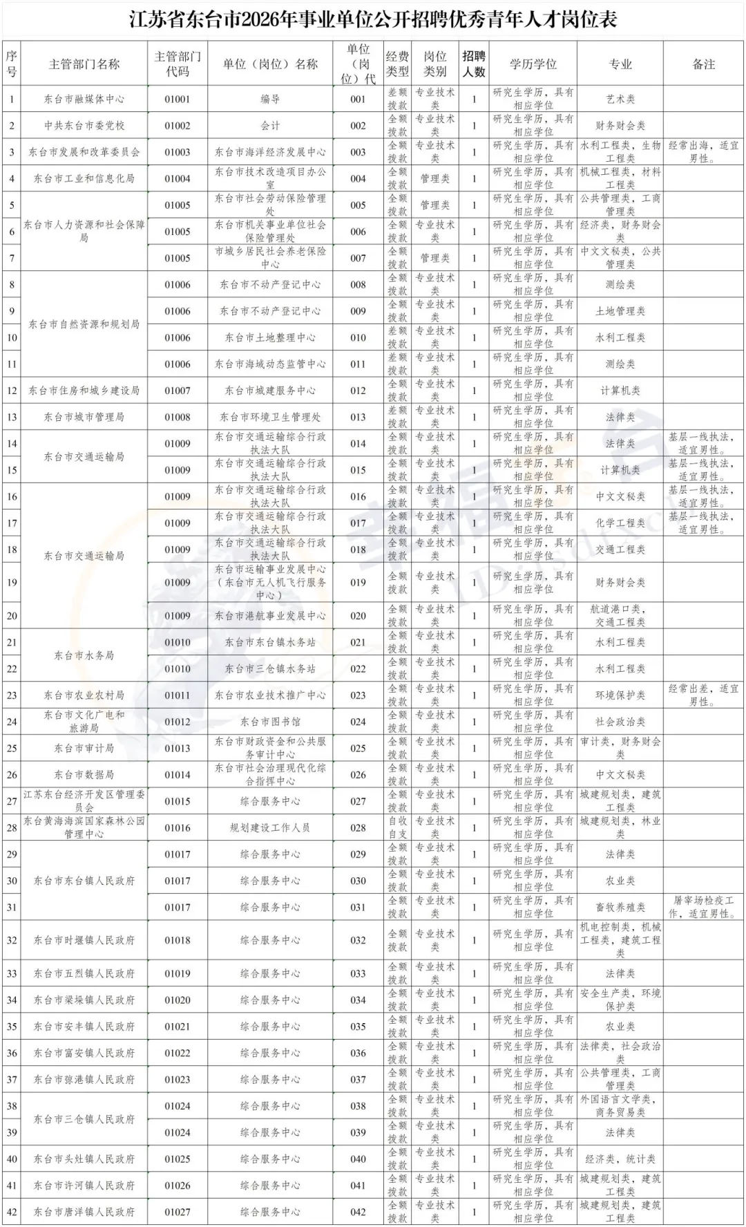 江苏省东台市2026年事业单位公开招聘优秀青年人才公告 为深入实施“黄海明珠人才计划”,结合用人单位需求,决定面向社会公开招聘一批优秀青年人才。现将有关事项公告如下。 一、招聘岗位 招聘岗位及条件等详见《江苏省东台市2026年事业单位公开招聘优秀青年人才岗位表》 二、资格条件 1.具有中华人民共和国国籍,遵守中华人民共和国宪法和法律,拥护中国共产党领导和社会主义制度。 2.博士研究生年龄一般不超过35周岁(1991年1月1日以后出生),硕士研究生年龄一般不超过30周岁(1996年1月1日以后出生)。 3.具有正常履行工作职责的身体条件和心理素质。 4.国家和省另有规定不得应聘到事业单位的人员,不得报考;国家和省另有规定不得到有关岗位工作的人员,不能应聘相应岗位。不得报名聘用后即构成回避关系的岗位。 5.法律法规规定的其他条件。 三、招聘程序 (一)报名 1.网上报名 报名采用网络报名方式。报名网址:盐城市人力资源和社会保障局门户网站(https://jsychrss.yancheng.gov.cn)。报名、照片上传和资格初审均通过网络进行。 (1)报名、电子照片上传:2025年11月15日9:00-2025年11月25日16:00;照片要求:近期免冠正面二寸(35×45毫米)证件照,jpg格式,大小为20Kb以下。 (2)资格初审:2025年11月15日9:00-2025年11月26日16:00。 (3)陈述和申辩:2025年11月15日9:00-2025年11月27日16:00。 (4)对初审异议的处理:2025年11月15日9:00-2025年11月27日18:00。 2.报名注意事项及资格初审 (1)本次招聘与盐城及所辖其他县(区)联动开展,符合报名条件的人员在规定时间内报名,每人在报名系统上可报考1个盐城市直岗位、1个县(市、区)岗位,具体报名方法详见报名系统。招聘部门(单位)按照有关资格条件,对应聘人员进行资格审核。招聘岗位设1:3开考比例,报名人数如未达到开考比例,将核减或取消该招聘岗位。应聘岗位被取消的报名成功人员可在规定时间内改报其他符合条件的岗位,补报名时间为2025年11月29日9:00-12:00。 (2)报名与考试时使用的本人有效居民身份证必须一致。报名时,考生要仔细阅读诚信承诺书,提交的报考申请材料应当真实、准确。提供虚假报考申请材料的,一经查实,即取消报考资格。对伪造、变造有关证件、材料、信息,骗取考试资格的,将按照《事业单位公开招聘违纪违规行为处理规定》等有关规定处理。考生与报考单位工作人员有亲属关系的,应当在报名时主动报告。 (3)应聘人员须具有国家认可的学历及相应学位。2026年毕业生须在2026年12月31日前毕业并取得学历、学位证书。国(境)外同期毕业人员,须于2026年12月31日前完成教育部留学服务中心学历学位认证。 (4)招聘条件中“专业”的设置目录为《江苏省2025年度考试录用公务员专业参考目录》(以下简称“专业参考目录”)。专业参考目录中没有的专业,如有院校开设并且有事业单位需要的,已列入招聘条件的“专业”要求之中。 专业参考目录和招聘条件中都未列出的专业、留学人员的毕业专业,由招聘单位或其主管部门根据招聘公告中明确的专业条件、应聘人员所学专业课程、研究方向等认定是否符合招聘岗位的专业要求。 3.网上确认 (1)招聘部门(单位)将按照本公告、国家和江苏省事业单位公开招聘人员相关规定对应聘人员的报名资格进行初审。应聘人员网上提交报名信息24小时后可到报名网站查询招聘部门(单位)资格初审意见。 (2)通过网站报名初审的人员,即报名成功。 (3)未按时在网上上传照片的视为报名无效。逾期不再提供报名服务。 (二)考核方式 本次招聘方式根据各岗位报名情况分别按两种方式组织实施:第一类是报名成功人数小于等于100人的岗位,采取两轮面试的方式开展考核;第二类是报名成功人数超过100人的岗位,采取“笔试+面试”的方式开展考核。 第一类:采取“两轮面试”方式考核 (1)两轮面试成绩总分均为100分,应聘人员最终成绩以第二轮面试成绩为准。 (2)第一轮面试。面试内容以适岗性评价为主,具体时间地点另行通知。通过资格审核的报考人员统一参加第一轮面试(报名人数不足15人的岗位不设第一轮面试环节,直接第二轮面试),面试成绩以百分制计算,保留两位小数,第三位小数按照“四舍五入”办法处理,60分为合格;面试没有形成竞争的岗位,70分为合格。面试成绩当场公布。 (3)资格复审。招聘部门(单位)在第一轮面试合格人员中,根据面试成绩从高到低的顺序,按照1:15的比例确定拟进入第二轮面试人选名单(含末位同分者),并进行资格复审,具体时间地点及要求另行通知。资格复审通过的,现场发放面试通知书,参加第二轮面试;资格复审未通过的,将被取消第二轮面试资格。如对资格复审结果有异议,可当场向负责资格复审的招聘部门(单位)陈述和申辩。资格审查贯穿公开招聘全过程。 应聘人员请在成绩公布后保持联系方式畅通,以便招聘部门(单位)通知资格复审,联系不到者视为自动放弃。 (4)第二轮面试。采用结构化面试形式,主要考察应聘人员的综合素质。面试成绩以百分制计算,保留两位小数,第三位小数按照“四舍五入”办法处理,60分为合格;面试没有形成竞争的岗位,70分为合格。面试成绩当场公布。 (5)确定体检考察人选。招聘部门(单位)在第二轮面试合格人员中,按照最终成绩从高到低的顺序,根据招聘岗位拟招聘人数1:1确定参加考察体检人员,并组织考察体检。确定