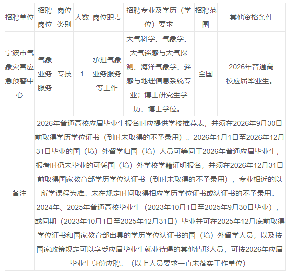 宁波市气象局下属单位公开招聘工作人员公告(一) 经浙江省气象局同意,宁波市气象局下属事业单位宁波市气象灾害应急预警中心决定面向全国公开招聘事业编制工作人员1名。现就有关事项公告如下: 一、招聘单位简介 宁波市气象局下属事业单位宁波市气象灾害应急预警中心为宁波市委机构编制委员会批复成立的正处级公益二类事业单位,经费预算形式为财政部分补助。主要负责气象灾害应急和突发公共事件气象服务保障;气象灾害预警信息传播;海洋气象服务,涉海涉港及旅游等行业气象服务;海洋气象综合观测体系建设;责任区气象灾害防御体系建设;相关业务研发推广,气象灾害风险评估和保险气象服务,气候可行性论证服务,气象宣传科普及媒体气象信息服务;突发公共事件预警信息传播及平台建设、运维;全市人影作业及作业安全、装备维护、人员培训和技术研究等工作。 二、招聘原则和办法 招聘工作坚持公开、平等、竞争、择优原则,按照德才兼备的用人标准,采取公开报名、统一考试和择优聘用的办法进行,通过面试、体检和考核等程序面向社会公开招聘事业编制工作人员。 三、招聘对象基本条件 (一)遵守中华人民共和国宪法、法律和法规; (二)遵守纪律、品行端正,具备良好的职业素质; (三)具有招聘岗位所需的学历、专业等要求; (四)具有适应岗位要求的身体条件; (五)具备岗位所需的其他条件。 四、招聘单位、岗位、人数、专业、学历和范围及资格条件 ![]() 五、招聘办法和步骤 (一)报名与资格审查 1、报名时间:2025年11月24日至2025年11月28日。 2、报名地点和联系方式:宁波市气象局人事处,宁波市海曙区气象路118号,联系电话:0574-89181829或89382016,邮箱:nbqxj@sina.com;联系人: 季老师或傅老师。 3、报名办法:从宁波市人力资源和社会保障局网站或宁波市气象局网站(zj.cma.gov.cn/dsqx/nbsqxj/)上下载并填好报名表(附件1),个人简历电子版(附件2,填写后转换为PDF格式)、应聘信息统计表(附件3)、近期免冠1寸照片及相关资料扫描件(包括身份证、学校推荐表、国境外学校学籍证明、考试成绩单、学历学位证书、获过奖的提供奖励证书)等在规定时间内发送到nbqxj@sina.com,并在发送后于工作日上午9:00—12:00或下午14:00—17:30电至0574-89181829或89382016确认。 邮件的主题名和附件的文件名请分别统一编写为“毕业学校—所学专业—学历—姓名”格式。 4、应聘人员提供的个人信息必须真实有效。报名时,招聘单位将对应聘人员的报考资格进行初审。证件不全或提供证件与报考资格条件不相符者,不能通过报名资格初审。 5、应聘人数与招聘计划数之比不能低于3:1,在规定的报名时间内,符合报考条件的应聘人数和招聘计划数比例不足3:1的,将核减岗位拟招聘人数或取消岗位招聘,具体核减岗位由宁波市气象局决定。 6、报名资格审查通过名单将于2025年12月4日前在宁波市气象局网站(zj.cma.gov.cn/dsqx/nbsqxj/)上公布。 7、资格审查工作贯穿于整个招聘过程中,在任一环节发现应聘人员的条件与招聘条件不符或者提供虚假材料等,立即取消应聘资格或聘用资格。 (二)考试 本次公开招聘考试采取直接面试方式,委托具有考试命题资质的独立第三方机构命题。 1、资格复审 面试前招聘单位将对通过报名资格初审的考生进行资格复审,请通过报名资格初审的考生于面试当天(或前一天)携带报名表,连同个人简历、近期免冠1寸照片及相关资料(身份证、国境外学校学籍证明、学历学位证书、学校推荐表、考试成绩单、获过奖的提供奖励证书)等到指定地点参加资格复审。资格复审未通过者不能参加面试。 2、面试 面试内容为综合基础知识以及与岗位相关的专业知识,主要测试报考者口头表达能力、应变能力、分析能力、回答问题准确性和举止仪表等。考生凭身份证和准考证参加面试,面试总分为100分,不足60分者淘汰。面试对象不按规定的时间和地点参加面试的,视作放弃。 3、成绩 在面试合格人员中,按面试成绩从高分到低分按1:1的比例确定体检、考核对象。如面试成绩相同,增加考试课目。面试成绩以及参加体检与考核人员名单于面试结束5个工作日之内在宁波市气象局网站(zj.cma.gov.cn/dsqx/nbsqxj/)上公布。 (三)体检与考核 参加体检人员在网上下载体检通知(或在接到电话通知)后,按要求时间到指定地点参加体检,体检标准参照《浙江省国家公务员录用体检标准(试行)》执行,未按要求时间到指定地点参加体检的,视为考生自动放弃。 体检结束后,招聘单位将对体检合格者的思想政治表现、道德品质、业务能力、工作实绩等情况进行考核。考核不合格的予以淘汰。 因体检、考核不合格或考生自动放弃出现招聘岗位空缺时,在面试合格人员中,按面试成绩以1:2的比例从高分到低分依次递补(仅递补一次,不重复递补,拟聘人员名单公示后不再递补)。 (四)公示与聘用 拟聘人员名单由宁波市气象局报经宁波市人力资源和社会保障局核准后,同时在宁波市人力资源和社会保障局网及宁波市气象局网站上公示七个工作日。公示期满后无异议,办理人事关系转移手续并签订聘用合同。聘用人员服务期不少于5年(含试用期)。拟录用人员由宁波市气象局统一安排用人单位,不服从安排的,取消录用资格。在办理人事关系转移手续时将审核档案资料,若发现招聘人员档案资料有不符合报考