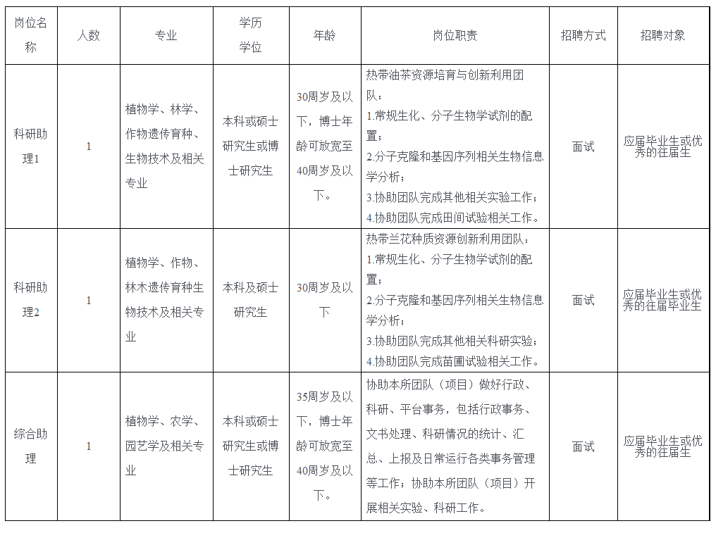 海南省农业科学院热带园艺研究所2025年第二次招聘公告 为了全面落实党中央、国务院“稳就业”决策部署和省委省政府有关工作要求,根据《海南省科学技术厅关于做好2025年度科研助理招聘工作的通知》(琼科函〔2025〕108号)要求,以及《海南省农业科学院关于项目聘用(编外)人员聘用及管理的指导性意见》(琼农院〔2025〕12号)规定,结合热带园艺研究所科研团队(项目)工作实际需要,决定面向社会公开招聘科研助理人员2名和综合助理1名。现就有关事项公告如下: 一、应聘基本条件 (一)应聘人员应具备以下条件 1.具有中华人民共和国国籍; 2.遵纪守法,具有良好的职业道德; 3.具有相关专业基础知识,掌握科研岗位要求必备的专业技能,具备一定的科研、管理能力和良好的发展潜质,符合应聘岗位要求; 4.取得相关学科专业的毕业证、学位证; 5.身体健康,责任心强,具有良好的沟通能力、团队合作能力,服务意识强。 (二)有下列情形之一的人员不得报名 受到党纪、政纪处分期限未满或者正在接受纪律审查的人员,以及受到刑事处罚期限未满或者正在接受司法调查尚未做出结论的人员,均不得参加应聘。 二、招聘岗位及要求