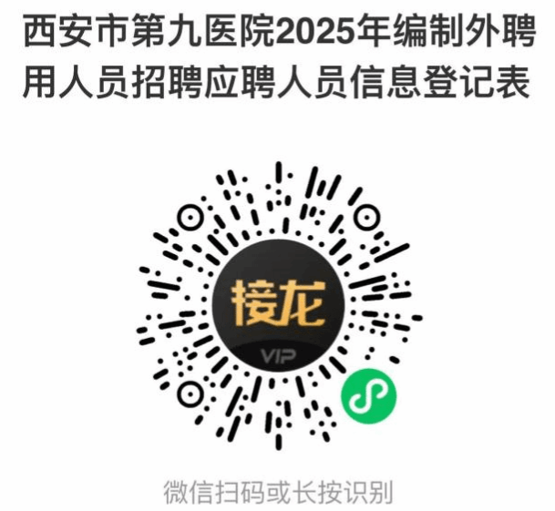 | 西安市第九医院是一所集医疗、教学、科研、预防、保健、康复为一体的大型综合性现代化三甲医院。医院开放床位1500张,为满足医院发展需求,现面向社会公开招聘编制外聘用人员,现将有关事项公告如下。 一、招聘原则 坚持公开、公平的原则,坚持德才兼备的用人标准,按照公开报名、资格审查、考试、体检与考察、试用等程序择优聘用。 二、招聘条件及岗位 (一) 基本条件 1. 具有中华人民共和国国籍。 2.拥护中华人民共和国宪法和法律法规,拥护中国共产党领导和社会主义制度,品行端正,遵纪守法。 3.有良好的职业道德,无不良执业行为记录。 4.爱岗敬业、服务意识强,具有高度的责任心,团队协作精神强,具有良好的沟通和人际交往能力。 5.掌握本专业基本理论知识及操作技能,能够胜任应聘岗位工作。 6.具备招聘岗位所要求的学历、专业和资格条件。其中,应聘人员须获得国家教育行政主管部门认可的普通高等院校毕业证书、学位证书;专业以国家教育行政主管部门公布的专业目录为准。 7.适应招聘岗位要求的身体条件和心理素质。 8.招聘岗位所要求的学历学位、资格条件应在报名截止日期前取得。 (二)招聘岗位、人数及具体条件详见《西安市第九医院2025年编制外聘用人员招聘岗位表》(附件1)。 三、招聘程序 (一)发布招聘公告 本次招聘在西安市第九医院官网(www.xasdjyy.cn)发布公告。 (二)报名时间和方式 报名时间:自公告发布之日起至2025年12月8日18:00 报名方式:用手机微信扫描以下二维码进行报名。