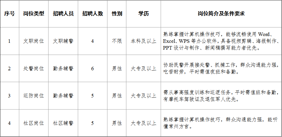 常州市公安局钟楼分局公开招聘警务辅助人员 根据工作需要和有关规定,常州市公安局钟楼分局面向社会公开招录警务辅助人员20名。现发布招录简章如下: 一、基本条件 1.中华人民共和国公民。 2.具有良好的政治素质,作风正派、吃苦耐劳、听从指挥,热爱警务辅助工作,具备履行岗位职责所需的身体条件、心理素质和工作能力。 3.年龄为22周岁以上35周岁以下(1990年12月至2003年12月期间出生),学历为大专及以上,部分岗位需本科;特别优秀的可适当放宽年龄至40周岁。 4.具备C2以上驾驶证,在常州有固定住所。 5.身体健康,五官端正,矫正视力不低于5.0,BMI指标在18.5-23.9之间,无严重的高血压、糖尿病、心脏病,无口吃、色盲、重听、纹身及肢体功能障碍,身体裸露部位无明显疤痕、色素癍,无传染性、危险性疾病。 6.具备招聘岗位所需的资格条件及要求。 7.有下列情形之一的,不予聘用: (1)本人或家庭成员、主要社会关系人参加非法组织、邪教组织或者从事其他危害国家安全活动的; (2)本人家庭成员或主要关系人正在服刑或正在接受调查的; (3)曾被追究刑事责任或者涉嫌犯罪尚未结案的; (4)编造、散布有损国家声誉、反对党的理论和路线方针政策、违反国家法律法规信息的; (5)本人或其配偶、直系血亲关系人因吸毒、嫖娼、赌博等受到处罚的; (6)被行政拘留、司法拘留或收容教育的; (7)被吊销律师、公证员执业证书的; (8)被开除公职、开除军籍或者因违纪违规被辞退解聘的; (9)从事警务辅助工作合同期未满擅自离职的; (10)被依法列为失信联合惩戒对象的; (11)其他不适宜从事警务辅助工作的情形。 二、招聘岗位 ![]() 三、招聘程序 (一)报名及资格初审 1.资料准备: (1)本人身份证、户口簿原件及复印件; (2)2张2寸免冠白底彩照; (3)毕业证书(须进行网上学历验证,请自行登录中国高等教育学生信息网,网址:http://www.chsi.com.cn/xlcx,点击“本人查询”模块后注册并查询,将查询结果页面打印后交验)及相关资格证书原件,并提供复印件一份; (4)个人征信报告。自行登录个人信用信息服务平台(http://ipcrs.pbccrc.org.cn/),打印个人信用查询结果,报告时间应在本公告发布时间之后; (5)本人自带市三甲医院(30天内,即11月25日—12月25日)的招工体检报告; (6)组织关系证明(中共党员需提供)。 2.参加报名时间: (1)报名时间:2025年12月20日—12月25日,期间工作日9:00-11:30,14:00-17:00,逾期不再受理。 (2)报名地点:常州市公安局钟楼分局(银杏路85号),咨询电话:0519-81994538(工作时间在线)。 (3)报名方式:根据《常州市公安局钟楼分局招聘警务辅助人员岗位简介表》,结合应聘者个人意愿,现场填写并提交《常州市公安局钟楼分局警务辅助人员招聘报名表》。 (4)注意事项:每位应聘者只可填报1个意向岗位。 (5)凡弄虚作假或不符合资格条件的,一经查实,取消报名、考试和聘用资格。 3.资格审查:由现场工作人员对应聘人员报名资格条件进行初审。 (二)体能测试。资格初审合格者,需参加体能测试。测试标准参照《公安机关录用人民警察体能测评项目和标准(暂行)》和《全国公安民警综合体能练兵手册》执行,测试内容包括男1000米/女800米跑步,纵跳摸高,4×10米往返跑等项目。体能测试合格者方可进入下一环节。体能测试时间、地点另行通知。 (三)笔试。体能测试合格者,需参加笔试,笔试采用闭卷形式,重点考核政治理论、法律知识、阅读理解、文字表达等内容,对专业性、技术性岗位,视情增加专业技术能力测试。笔试时间、地点另行通知。 (四)面试。根据笔试成绩从高分到低分,按照1:2比例确定参加面试人选。笔试成绩相同、符合进入面试环节要求的,可不受比例限制。面试采用结构化面试方式进行,重点考察应聘人员思想状况、组织应变能力、处理问题能力、沟通协调能力和岗位匹配性等。面试时间、地点另行通知。 (五)考察、政审。按照有关规定,对面试合格者进行考察和政审,同时复核考察对象是否符合招聘岗位要求及相关材料是否真实准确等。考察(政审)不合格的,不得进入下一环节。 (六)公示录用。根据综合考察结果,确定拟录用人员名单并进行公示,公示期为3个工作日。公示期满,没有影响聘用情形的,办理聘用手续。聘用后须有2个月试用期,试用期满并考核合格的聘为正式辅警。 部分岗位根据实际需要,视情调整体能测试、笔试顺序,具体以招聘单位通知为准。在考察、公示等环节,因应聘人员放弃、不合格等原因出现计划缺额的,可择优递补。 四、聘后管理与待遇 新聘人员按照《常州市公安机关警务辅助人员管理办法》进行管理,具体薪酬由用工单位根据岗位类别及考核结果发放,并缴纳“五险一金”,办理人身意外伤害保险。 免费学习资源(关注可获取最新开课信息) |