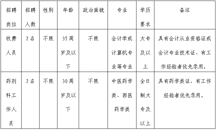 | 元阳县中医医院2024年第一次 公开招聘编外人员的公告 元阳县中医医院前身为元阳县新街镇卫生院,1987 年4月,经元阳县人民政府批准,在原新街镇卫生院的基础上成立元阳县民族中医院,2013年1月经县人民政府研究决定,将元阳县民族医院整体转型为元阳县中医医院,恢复中医医院独立建制,在元阳县医疗卫生服务体系中占据着重要的地位。在县委、县政府及卫生行政主管部门等相关部门的正确领导和各界人士的关心支持下,在历代医院全体职工的辛勤付出下,医院各项事业取得了长足的发展,为全县各族人民的健康做出了应有的积极贡献。医院领导班子高度重视医院的发展和建设,抢抓政策机遇,强化医院内涵建设。 为加强元阳县中医医院人才队伍建设,改善人才队伍结构,优化医院的人力资源配置,提高医院医疗、护理质量,促进卫生健康事业可持续发展,根据我院用人需求,“公开、平等、竞争、择优、德才兼备”的招聘原则,现面向社会公开招聘人员4名(收费人员2名、药剂科工作人员2名),现将有关具体事项公布告如下: 一、 招聘岗位和条件  二、招聘基本条件 (一)报考人员应具备的条件 1.具有中华人民共和国国籍,拥护中国共产党的领导,遵守宪法和法律; 2.热爱医疗卫生事业,遵纪守法、品行端正、吃苦耐劳,服从组织,尊重领导,团结协作,敬业爱岗,乐于奉献;有较强的事业心和责任感,具备良好的沟通、协调和应变能力; 3.适应岗位要求的身体素质:身体健康,无残疾,无传染病及慢性疾病; 4.具有应聘岗位所需的学历、专业和技能; 5.具有岗位所需要的其他条件; 6.有特殊专科特长、学科带头人、技术骨干、同级及以上医院工作经历、在原单位有优秀共产党员、先进工作者荣誉称号等可优先录用; 7.符合岗位规定的年龄要求,年龄计算时间截止2024年1月31日止。 (二)有下列情形之一者不得报名应聘: 1.受过党纪政务处分,其影响期或处分期限未满的; 2.受刑事处罚期限未满或正在接受司法调查尚未做出结论的人员; 3.身体原因不符合聘用的; 4.法律法规规定不得聘用的其他人员; 5.曾参加各级公务员、事业单位招聘考试违纪人员不满5年的; 6.因作风问题被原单位辞退的; 7.原在我院工作自动离职或被解除合同的; 三、报名及资格审核 (一)报名 1.时间:2024年1月15日至17日(上午9:00-11:00,下午:15:00-17:00); 2.报名方法:以本人现场报名的方式进行(之前投递过简历的也需要现场报名); 3.报名地点:(1)、收费人员到元阳中医医院综合楼四楼,联系人普老师,联系电话:13769489656;(2)、药剂师到外科住院楼一楼,联系人高老师,联系电话:15394829173;   (二)报名资格审核 考生对所提交的材料和填写信息的真实性负责,若存在弄虚作假行为,一经查实,取消聘用资格,造成的后果由考生本人承担。 1. 时间和地点:报名时现场审核; 2. 资格审核时需要提交以下材料: (1)《元阳县中医医院合同制人员招聘报名表》(附件); (2)报名所需材料:报名人员携带本人简历一份,自荐信、有效身份证、毕业证、学历认证报告、相关资格证书或考试合格有效成绩证明、荣誉证书等岗位条件所有需提交的原件和复印件; (3)与报名资格条件相关的其他证明材料。 四、聘用待遇 1.按照元阳县中医医院编外人员职工待遇发放; 2.职业发展:提供职业晋升通道和良好的发展空间,提供专业的培训、学习、外出进修机会。                   五、招聘程序 考生统一参加面试,资格审核合格者按照1:3的比例参加面试,只面试,不笔试。 (一)面试:面试主要考核考生的基础知识和相关专业知识、综合素质、心理健康程度、逻辑思维能力,应急反应能力,分析判断能力,人际沟通能力,语言表达能力、求职动机与拟聘职位匹配性、仪容仪表等;面试时间:2024年1月18日上午9点(具体面试时间以通知为准),地点:医院综合楼五楼会议室。 (二)计算考试成绩,确定录用名单,择优录用; 根据综合成绩由高到底顺序依次招聘,综合成绩出现并列时,分别以是否具备相关执业资格、学历、有“二甲”以上医院工作经历依次排列招聘。考试成绩将在医院综合楼一楼进行公示。 (四)健康体检:参照公务员录用体检标准加传染病进行体检,体检时间2024年1月23日,体检费用自理;体检合格者,接到通知后按时上岗,如有体检不合格者,按总成绩的名次,从高分到低分的顺序依次递补。                                  (五)拟聘人员公示:根据考试总成绩、体检结果等拟定聘用人员,在公示栏进行公示,公示期为5个工作日。公示期满后,没有反映问题或反映有问题,经查实不影响聘用的,根据相关流程办理进行办理入职手续。对反映有影响聘用问题的并经查实,不予聘用;为保护个人权益,反映问题时必须实名反映,公示期过后不再反映问题。未按照规定时间内报到者,视为自动放弃,将按照最后公布成绩高分递补录用下一名。 公示期过后,拟聘人员根据通知报到时间到院办(人力资源科)报到,录用试用期3个月,试用期满后医院将根据所在科室考核情况,对考核合格人员,给予办理有关聘用手续,对在岗试用期间考试考核不合格者,给予辞退。 特别提醒:1.凡考生未在规定时间内按要求参加面试、体检、报到等情况的,视为自动放弃应聘资格2.报考人员务必保持报名时所留电话畅通,如果因为报考人员电话联系不上造成的后果,完全由本人自己负责;3.通过所有考核和体检合